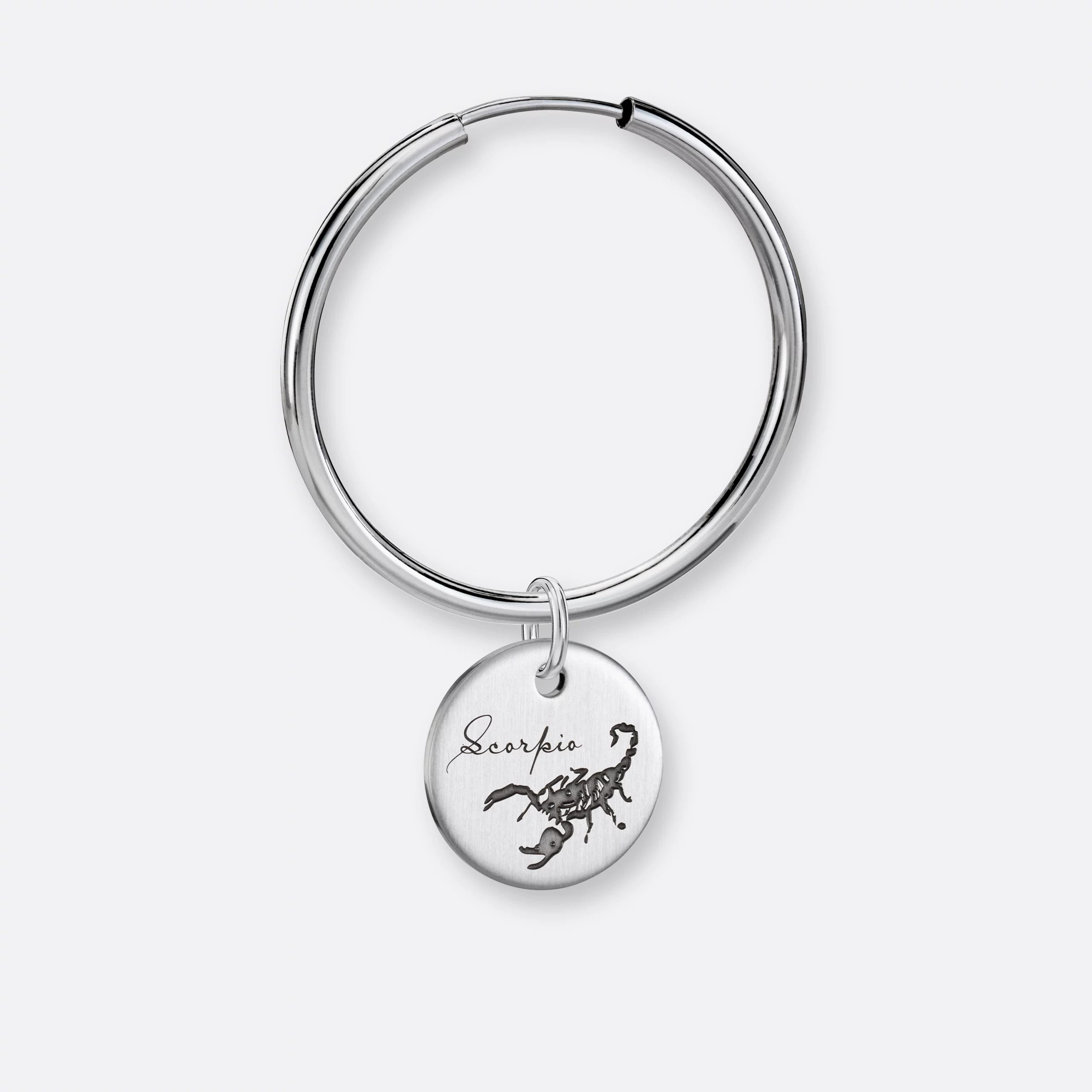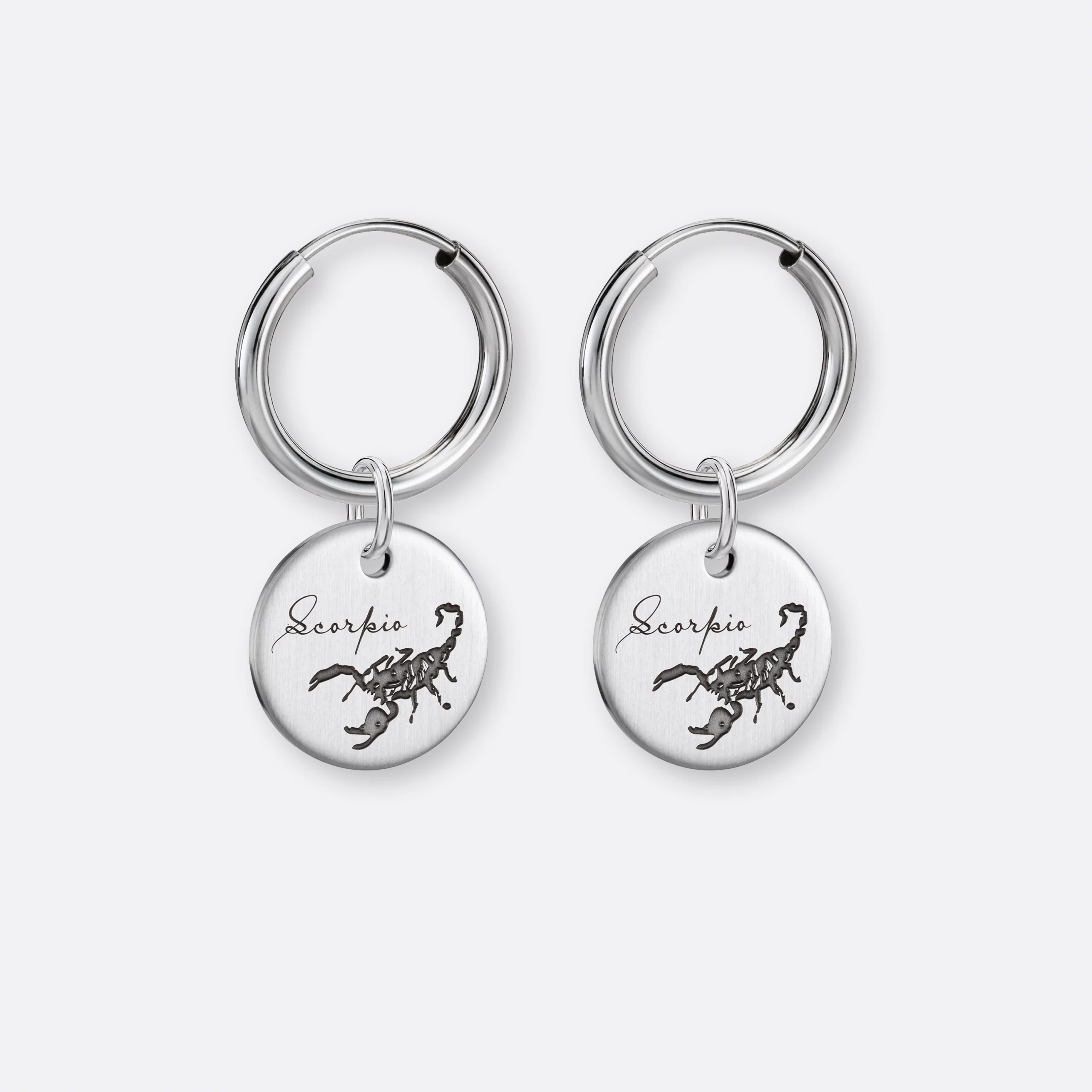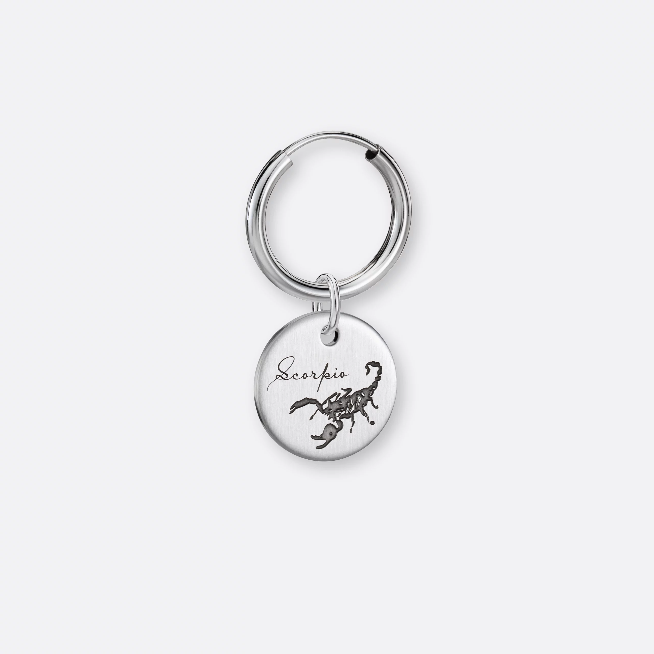 Der Skorpion Ohrring mit dem runden gravierten Anhänger-Coin aus 925er Silber ist ein wunderschönes und persönliches Schmuckstück für Menschen, die im Zeitraum vom 23. Oktober bis zum 21. November geboren wurden. Die Skorpion-Eigenschaften wie Stärke, Entschlossenheit und Furchtlosigkeit werden durch den Anhänger und das Design der Ohrringe überzeugend zum Ausdruck gebracht. Der Skorpion Ohrring wird in sorgfältiger Handarbeit gefertigt und ist ein schönes Geschenk in höchster Schmuck-Qualität.